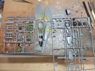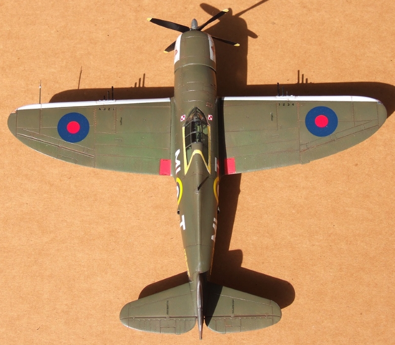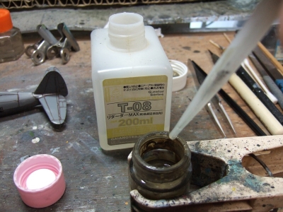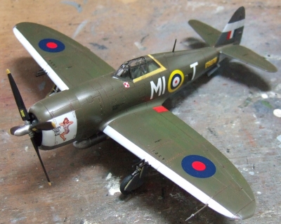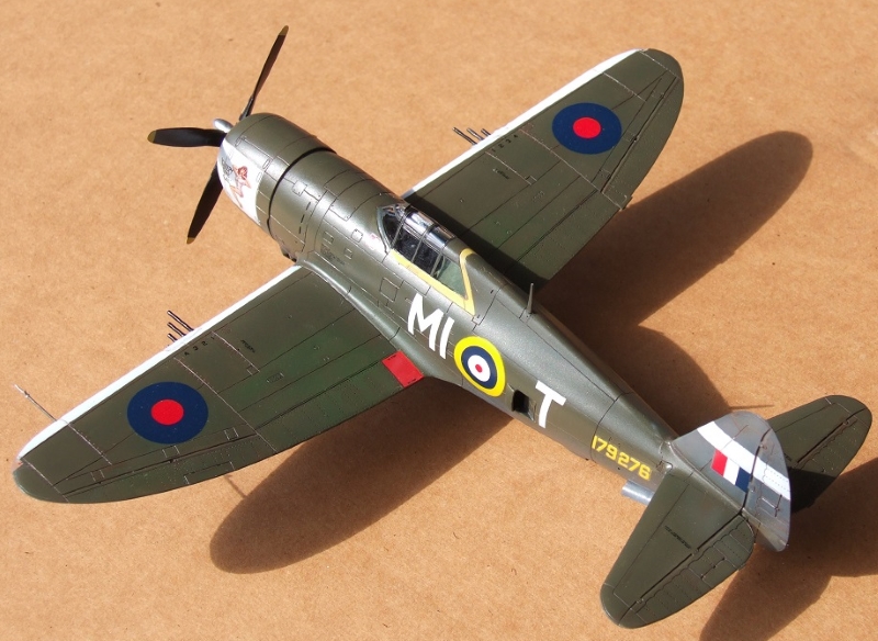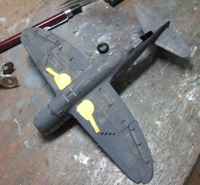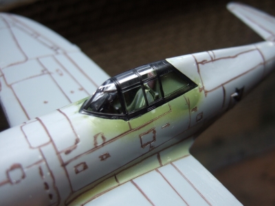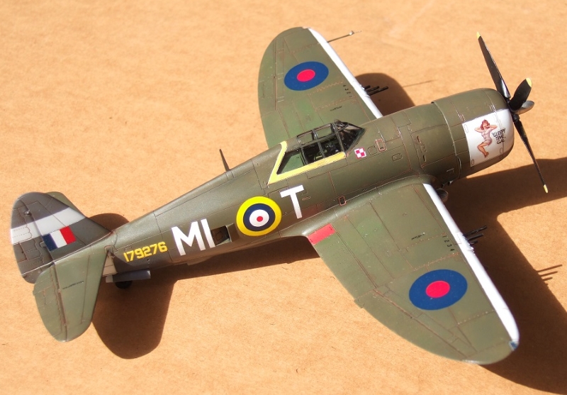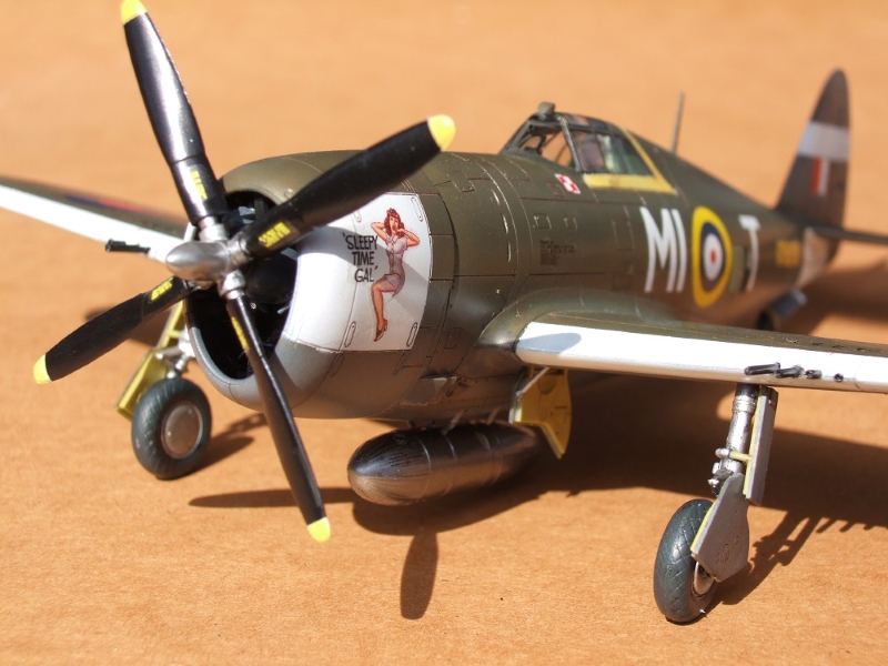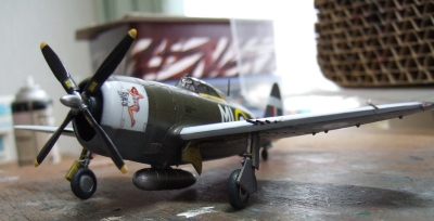 (写真8) 今回この色に塗ったのはこのノーズアートを貼ってみたかったから。キットに同梱されていたものだったんだけど、何故かどーゆー訳かアメリカ国籍マークのデカールが切り取られて行方不明!(理由は大体予想つくけど)まったく油断も隙もあったもんじゃありません。仕方が無いので余ってたイギリスデカールで勝手にデッチアップ。そんなんで「機番が違う」とか「部隊ステンシルが有り得ない」とか言いっこなしw
