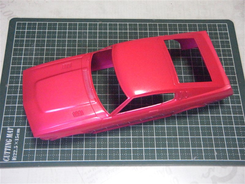 | では製作開始です。ボディはスジバリを軽く削ぎ、そのまま塗装します。はじめGXメタルピーチを吹いてみたのですが、どうもくすんだ感じというか、自分のイメージと異なるような気がしたので、C174蛍光ピンクを塗り重ね、その上から薄く溶いたメタルピーチを遠目に吹き、軽くラメ入れしました。仕上げにGXクリアーⅢをトリガー全開でドバ吹き3回。このまま終了です。窓枠など細部塗装は無し。今回はこういう仕様です(図5)。 |