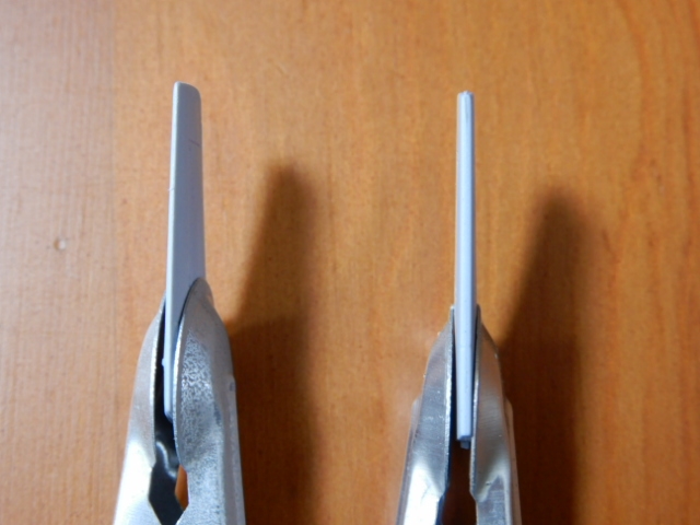垂直尾翼は,接着面を(右側は,特に厚いので表面も。こちらには,凸モールドが無いので助かりました。),主翼と水平尾翼は,表面をがしがし削りました。舵面は,凹モールドなので,表からがしがし削っても簡単にはパネルラインが消えることがありません。後縁をカミソリみたいにしたい人は,カッターなどでパネルラインを復活させつつ満足いくまで,五六式のような凡人は,適当なところまで削るとよいでしょう。