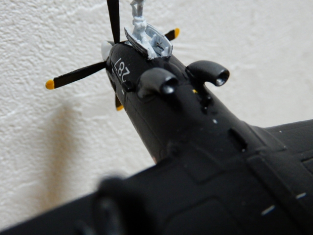 4枚のブレードが貧弱で,形も大きさも揃っていません。スピナーのはめ込みがきつくて一旦押し込んだら外せなくなりました。おまけに塗装もややこしいし・・・。