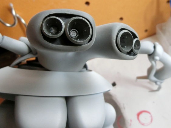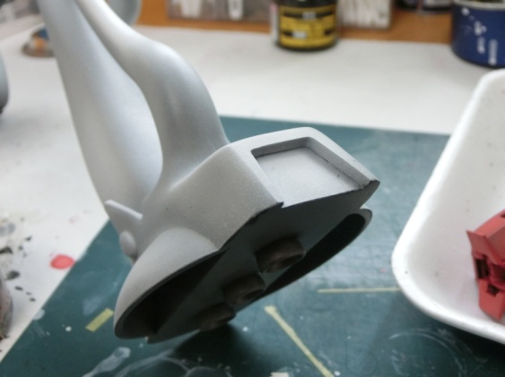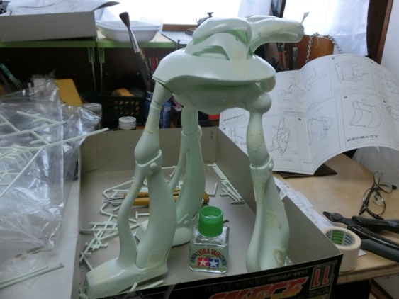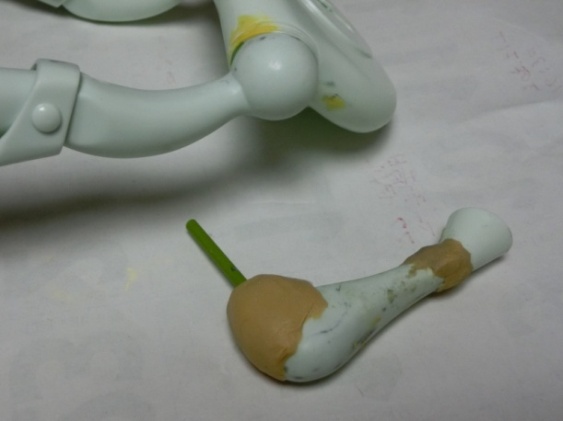 それならば少しポーズをつけてみてはどうかと余計な(?)ことを思いつきました。前足を大きく曲げた状態で固定するため、関節部をエポキシパテで成形。足裏はのっぺりしていて寂しいので、ウェーブの汎用バーニアを取り付けます。