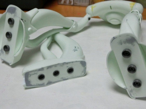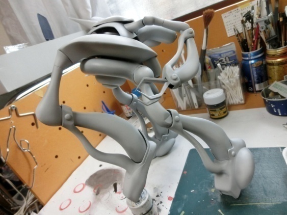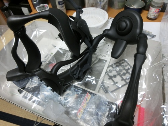 大体組みあがったら、塗装に入ります。ほぼ白一色なので楽といえば楽なのですが、黒から立ち上げたため大量に塗料が必要になりました。でかすぎて机からはみだしております。