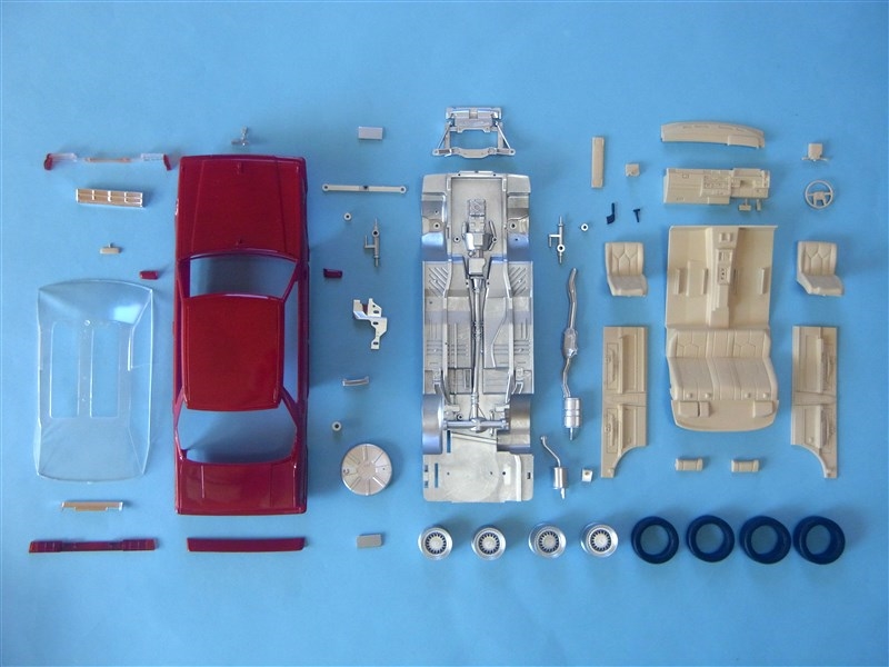 塗り終えた各パーツ(塗り直し前)です(図6)。シャシーはC8銀、フロアはC45セールカラーです。後はGクリアーでパカパカっと組み上げてしまえば完成です。なお、ドアミラーは水性ボンドで仮止めしておきました。