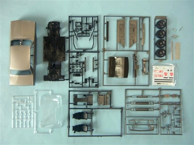 パーツ構成です(図3)。昔の車プラモらしいオーソドックスなものです。かつてのギミックであるモーターライズが廃されたため、ボリュームとしてはあっさりしています。 お疲れ様気味の金型は少しスジバリが多いですが、ユーザーで対処できる範囲です。シャシーはフジミ名物「汎用板シャシー」。ロールバーなどのA枠も他キットと共用です。顔面はS49/ S50年モデルの選択式。ホイールはワタナベが奢られています。