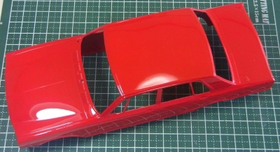製作開始です。まずはボディ塗装です。カラーは赤にしてみました。歴代スカイラインの中で赤単色が一番似合うのはハコスカ系ではないでしょうか。というわけで、いったんクールホワイトで下塗りしてからC3赤を吹き付け、仕上げにスーパークリアーⅢをたっぷり吹いてハイお終い(図5)。窓枠など細部塗装は端折りました。