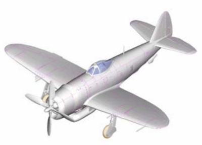 ④第2次大戦で登場したアメリカの超重量級戦闘機です。リパブリック社の開発によるもので、原型機は1941年5月に初飛行しました。P-47Dは主要な量産型で、1943年からは主翼に爆弾を搭載し、戦闘爆撃機としても大活躍しました。全長23㎝、全幅26㎝、機体は精密・正確にモデル化、胴体および主翼には詳細なスジボリを彫刻しました。パーツ数40以上。
