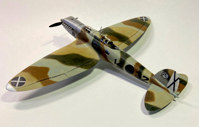 又それぞれの色を重ね合わせ調色します。翼端、垂直尾翼にホワイトをさし主翼下面に後の連合軍のインベイションストライプ風の黒帯を塗り上げて、塗装完了です。