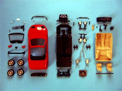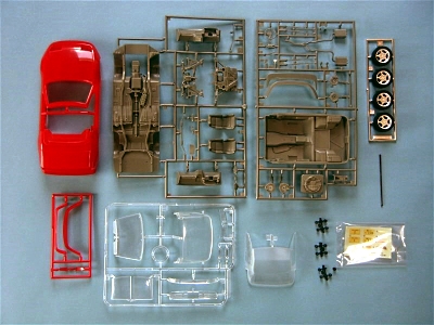 パーツ構成です(図3)。実車同様ノーマル版のバリエーションという位置づけなので、ボディとBピラー、ソフトトップのクリアーパーツのみが追加部品です。ボディはともかく、Bピラーのパーツの成型色がなぜ赤なのか、ちょっと不思議です。