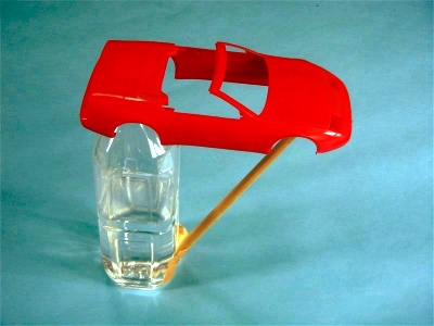 で、次に困ったのがボディの固定です。(図6)。両面テープをペタッと貼る屋根がありませんので、適当にペットボトルと割り箸で固定冶具をあつらえました。