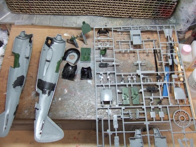 (写真13)胴体組んで羽根を付けたら一気に邪魔、ぢゃなくて完成が見えてくる。勢いに乗って垂直尾翼と防眩色を塗りまくりますぜ・・・・まぁ取り回しに困るのは間違いないんだけどね。