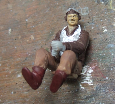 (写真4) 顔の皺や目元をレッドブラウンでスミ入れした後に肌色をぺたぺた。ジャケットはウッドブラウン軽くドライブラシ。