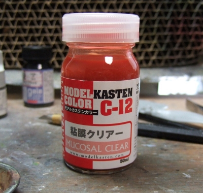 (写真5) 今回のお試し色はこの粘膜クリアー。以前からちょっと使ってみたかったんだよね。フィギュアの要所に塗るだけだからこんなに大量に要らないんだけどこの分量でしか手に入らないから仕方がない・・・・はっ!これはひょっとしてそんだけ大量に作れとの天の啓示?