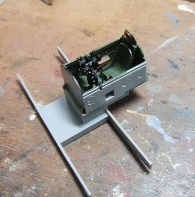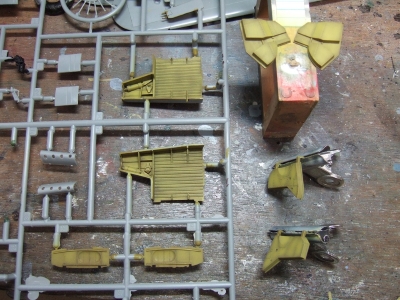 (写真9) 下地にカーキを塗った後に黄色のジンクロをぷーと吹く。この辺りもパーツ数の少なさに助けられとるね。ありがたいこっちゃ。