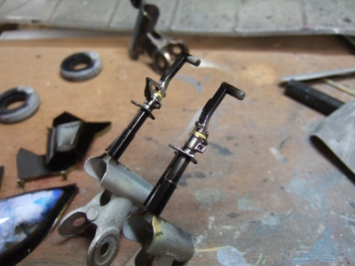 (写真16)主脚はダンパーシリンダーの所だけメッキシルバーで塗ってマスキング。