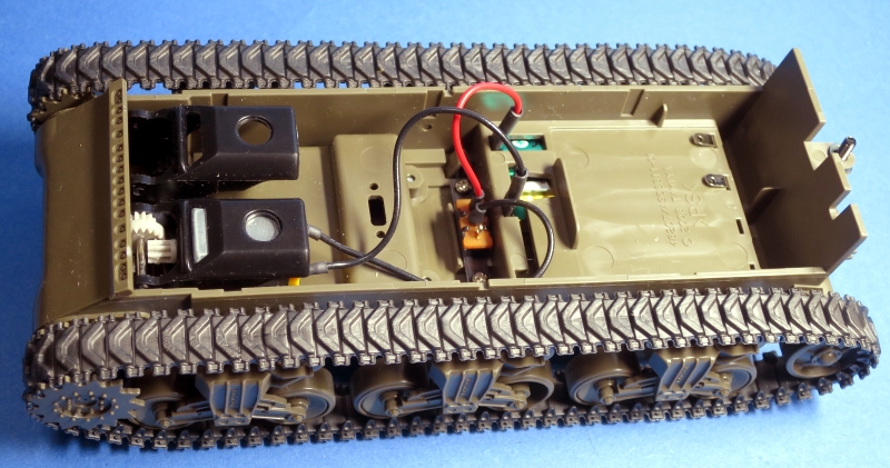 メーカーさんが2モーターラジコンを1モーターシングルにしたものだから、ダミーのギアボックスが片側にそっくり入っている構造です。少年時代にリモコン戦車にはまった元模型少年としては、もう1個ギアボックスを入手すると、リモコン化出来るのではないかと夢が膨らみます。