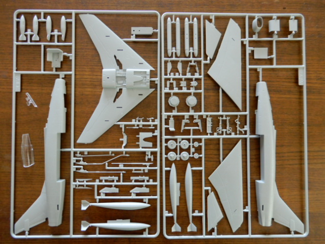 部品数は,62で,オプションパーツがあるので実質50〜60パーツぐらいです。デカールは,派手なアメリカ空軍と三色迷彩のフランス空軍と珍しいナチュラルメタルのデンマーク空軍。一番活躍したベトナム迷彩機用のデカールは入っていません。
