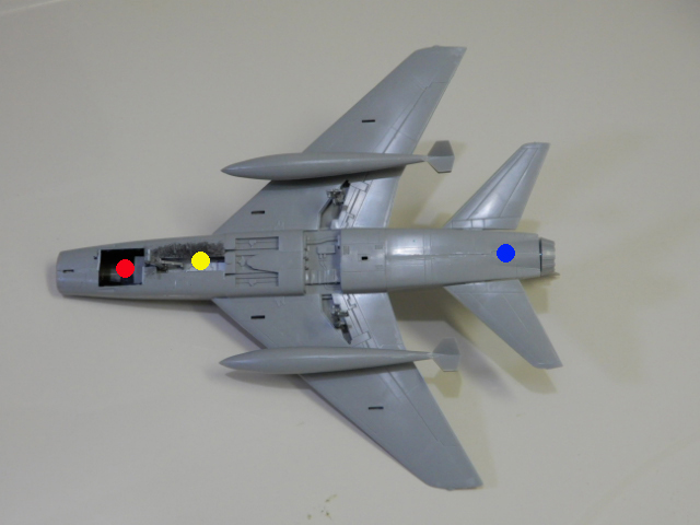 おもりもこの段階で組み込むことができるので便利です。組み立て説明図では,おもりを20g入れるよう指定していますが,釣りのおもりを叩いて整形したものを先端に押し込めば,6gで十分でした(てこの原理)。ジェットインテークのパイプを再現する今風のキットだったら,おもりを組み込むのに苦労するかもしれません。