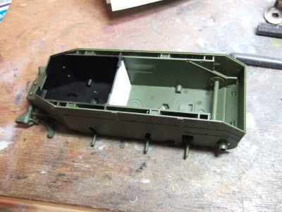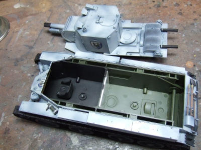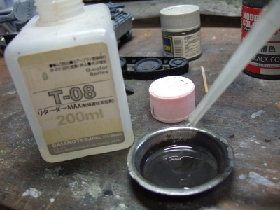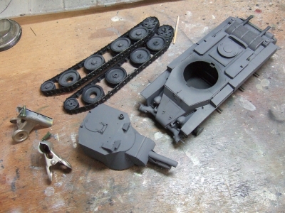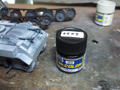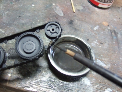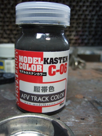 (写真10) 今日びのAFVモデラーは全部組み立ててから塗るってのがトレンドのようなので不詳わたくしめも真似してみました。転輪もアイドラーやドライブもポリキャップで後ハメ可だから履帯くっつけた後に取り外して別塗りすることに。なるほどこいつは便利、親切設計じゃね。影になる部分にフラットブラックでシャドー吹いときます。