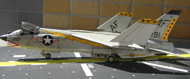 キットのデカールはVF-11とVMF-235が選択できます。今回エアロマスターデカールから派手な電光マークと黄色に黒い星がかっこいいVF-33で仕上げることとしました。ただ印刷はイタリアのカルトグラフですので発色は最高なのですが デカール本体が固いこと固いこと、局面になじませるのに大変難儀しました。軟化剤もあまり効き目がありませんでした。あちこち皺だらけになりながら何とか見られる程度にごまかしました。デカールでは翼端が黄色地に黒の電光になっていますが 私が見たE型の写真では黒い星のものしか見つけられませんでしたので ここはベースに黄色を塗って黒い星をデカールストックから探して貼りました。
