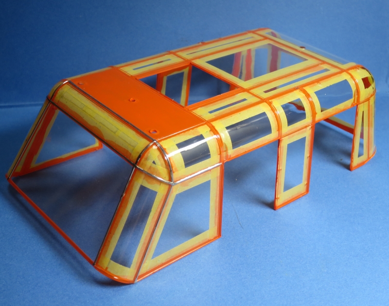 タイヤホイルは白、車体はステンレス系のシルバー色、内部色はオレンジが基調です。車体内部はテレビ版のプロップを忠実に再現しているように見えます。銀色生地の遮光カーテンはプラ部品では派手さが今一つなので100均のデコ包装材コーナーで売っているアルミ蒸着シートを切って自作しました。カーテンレールも洋白線で自作しています。