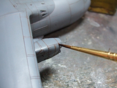 今回は着陸状態なのでフルフェザーの状態を選択したんだけれど一枚ポキッと折っちゃった。しょーがないので真鍮線とつぶした真鍮パイプでリカバー。繊細なパーツなので取り扱いには充分注意せにゃならんね。皆様はお気をつけを。