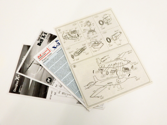 胴体に燃料タンクやロケットノズルを仕込むため,テールヘビーになりますが,組み立て説明書には一切の説明がありません。尻餅をつくのが前提なのか,スタンドが付属しています。かといって,飛行姿勢にすると,パイロットのフィギュアがついていないので不自然です。流用しようにも,1/144スケールのキットに付属するパイロットフィギュアそのものが少ないし,X-1の飛行時のパイロットの姿勢は,膝を伸ばしたまま座るというものだったのでフィギュアの改造も必要です。