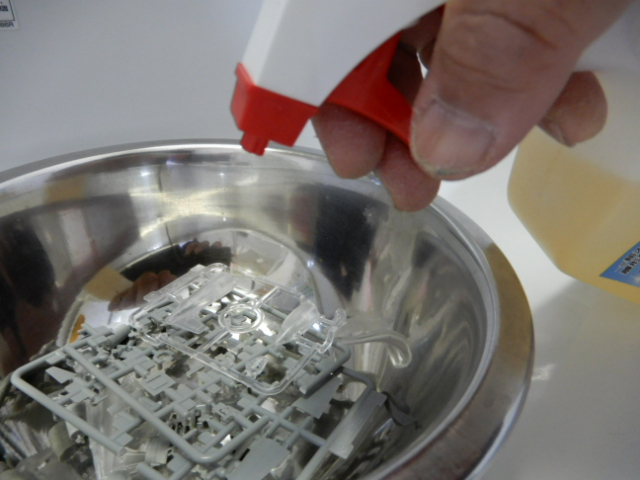 部品を一週間,中性洗剤を溶かした液に漬けていたのに,塗料をはじきました。さすが,中華キット。仕方が無いので(気をつけていても手が荒れる)ファインモールドのご機嫌クリーナー(離型剤落とし)でもう一度洗浄しました。