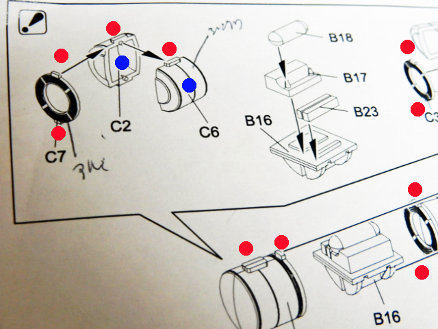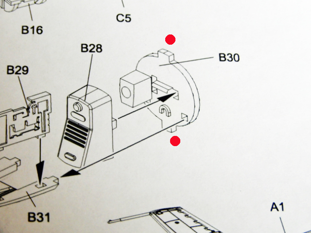 機体に内蔵させる部品の組み込みは,ややきつめになっています。部品を塗装すると,さらにきつくなるので部品の上下にある位置決めのための出っ張りを削って調整します。強引に部品を差し込むと,二度と出せなくなるので調整は慎重に。