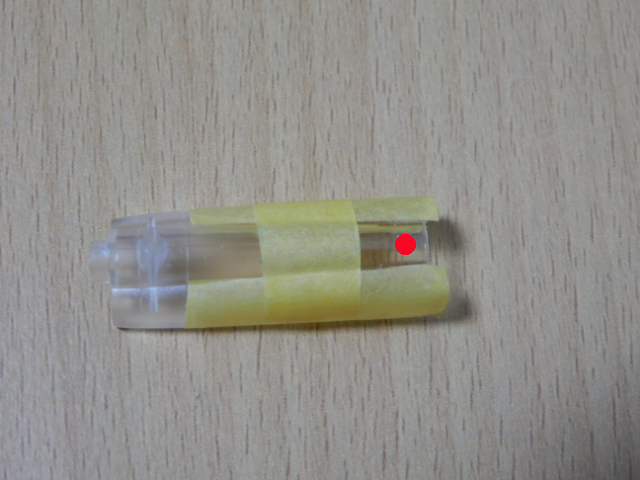 赤丸のところを削って調整する。青丸のところにおもりを仕込む。