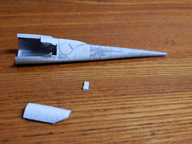 で,Uのキットの説明書を見ると,前の方の燃料タンクに7gおもりを仕込むと書いてあります。このキットは,半分の寸法なので必要なおもりの重さは,7/8g,約1g仕込めばよいということになります。五六式は,釣り用の粒おもりをタミヤのプラパテと一緒に仕込んでみました。