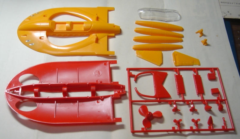 上が部品一覧です。部品点数も少なく、無塗装でおおまかに組んでみると、水中モリの発射口が大きかったため、ニューム管を埋め込み 小さくしました。結局、ゴム動力潜水と、魚雷のゴム発射をあきらめ、オモリをはずして、スケールモデルとして製作することにしました。