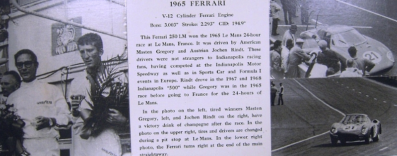 写真のフェラーリ250LM はインディアナポリス・モーター・スピードウェイ内の博物館に展示してあったものです。