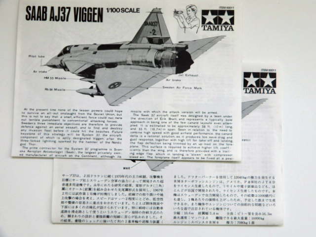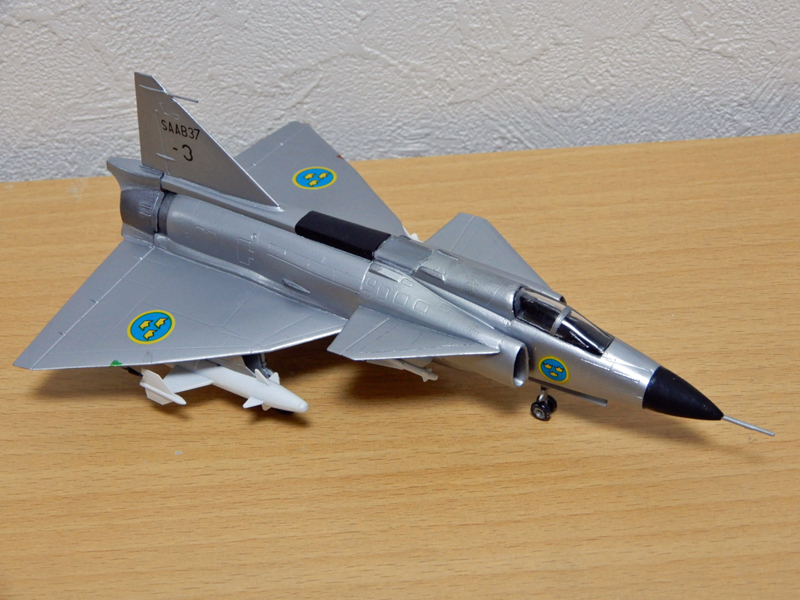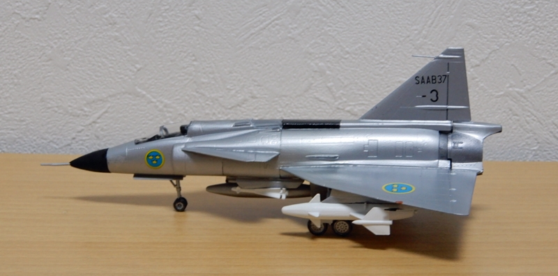 キットは,ハセガワの1/72スケールのキットと同じく,試作第1~3号機を再現したもので,試作4号機以降の機体や実戦配備されたAJ 37とは,主翼前縁やベントラルフィンの形状,レーダー警戒アンテナフェアリングの位置などが異なっています。
