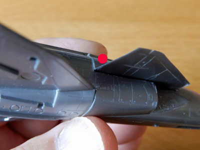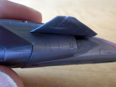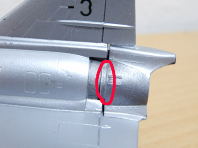4 ジェット排気口が,本体にフィットしないので干渉する部分を削り込みました。また,エレボン後端とのラインがつながらないのでプラ板を貼って整形し,ラインが自然につながるようにしました。