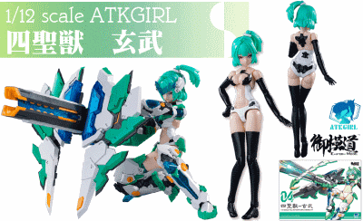 ④1/12スケールATKガールに新しく玄武が登場します。3種類のタンポ印刷済み顔パーツのみならず、未加工顔パーツも付属。専用デカールを使えば、好みの表情で作ることも可能です!キャノン砲や蛇腹剣、合体ギミックを備えたシールドと装備品が盛りだくさん。関節パーツだけでなく、武装パーツも可動範囲が広いため細かい動きも再現が可能です。 完成時サイズ:約16.0㎝