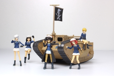 ④最終章 第3話が公開され、7月からはBS12トゥエルビでTVシリーズの放送も決定。ますます盛り上がりを見せる中、プラッツのガールズ&パンツァーのラインアップに楽しいキットが加わります。大洗女子学園の船舶科チーム、サメさんチームのMk.Ⅳ戦車の塗装済み完成モデルに1/35スケールでモデル化されたフィギュアをセット。