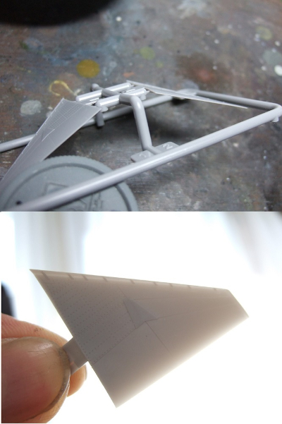 (写真1)ファインモールド渾身の新作F4ファントム。このキットの見所の一つがパーツの繊細さです。見よこのペラペラな水平尾翼。ランナーに付いてる状態でこの始末。光に透かせば反対側のモールドが見えちゃうよ的な薄っぺらさ。すげえな、おい。バリも無いしこれでちゃんと湯が回ってるってのが信じらんない。どんだけの金型精度なんですか。