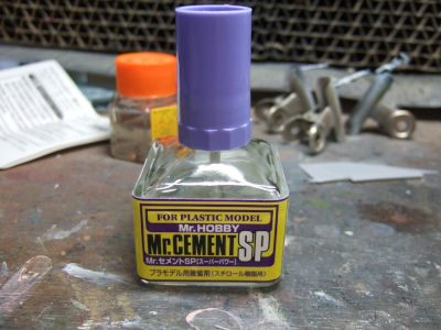 (写真2)ちう訳でこの超絶パーツのモールドを台無しにするわけには行かないので今回メインで使う接着剤がコレ。GSIクレオスのMrセメントスーパーパワー(なんちゅう名前じゃ)。流し込み接着剤の中では一二を争うちょー強力なヤツ。タミヤの同系統のブツとどっちが優れているのか分んないけれど個人的にはこっちの方が好み。臭いは今まで以上にキョーレツだけどね。