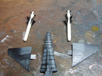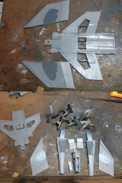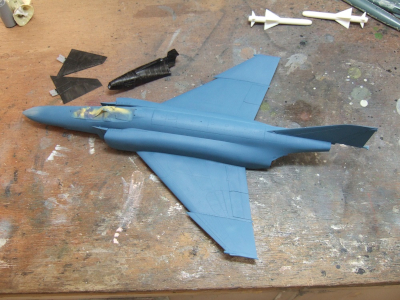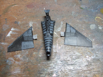 (写真5) ある程度組んだら主翼の前縁だの垂直尾翼だの透けたらアカン的な場所を濃いめのグレーで下塗り。水平尾翼は後で真っ黒に塗るから取り敢えず置いとく。で、実はこのファインファントムのトピックが「できる限り塗り分けする箇所を別パーツにする」って所なんだそうです。つまりバンダイの色プラとかと同じ方法論でエアブラシ一発塗りへの特化、マスキング不要街道を邁進するパーツ割りってことですね。