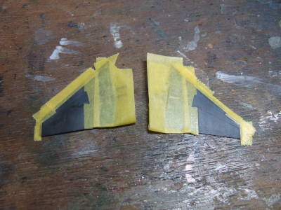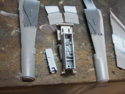 (写真10) 金属地剥き出しじゃない部分を塗るためにマスキング。流石にファインも水平尾翼をバラバラにはしなかった。まぁその方が正解だよ。色別に木っ端微塵になった尾翼なんて正直組みたくないもんね。