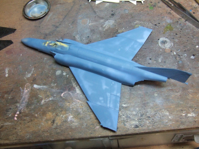 (写真6)ざっくりヒコーキのカタチになったら下塗りに突入。ミディアムブルーでばーっと塗って指定色でアクセント入れて濃いめの青で迷彩入れて指定色で退色入れたらほぼおっけ~。下面色が無いから楽でいいのう。ついでに尻尾の部分と水平尾翼も下塗りでグロスブラックで塗っときます。