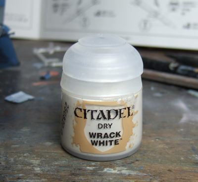 (写真13) 今回は色々と盛り沢山じゃ。初めてシタデルカラーを試してみました。塗膜がウルトラ頑丈で乾くのがちょー早く鬼のような隠蔽と言われるヤツです。巷で色々と噂されてるからずーっと気になってたんだよね。ただ純粋にホワイトが欲しかったのに何故かバリエーションの中に無い。なして?しょーがないので白に極めて近いと思しき色をチョイス。ただコレは基本色の「ベース」ではなくて「ドライ」と呼ばれる種類で恐らくドライブラシ用に調整された塗料みたい。中身が液体じゃなくてパテ状なのよね。