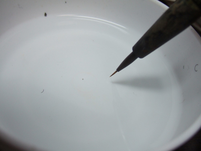 (写真16) 水皿の水面に筆先をちょん。水分はこれでおっけ~。足りなくなったらまた後で補給すれば良いし。