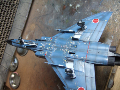 (写真19)取り敢えず完成。吊り下げ物のASM-1はこれから塗るんだけどね。しかしEJ改がASM-1を運用出来たって今回初めて知ったよ、追加された能力は非火器管制系の電子装備だけかと思ってた。退役した後に事実を知るってのもアレだけど知らないよりはずっとマシってことでカンベンして下さいね。