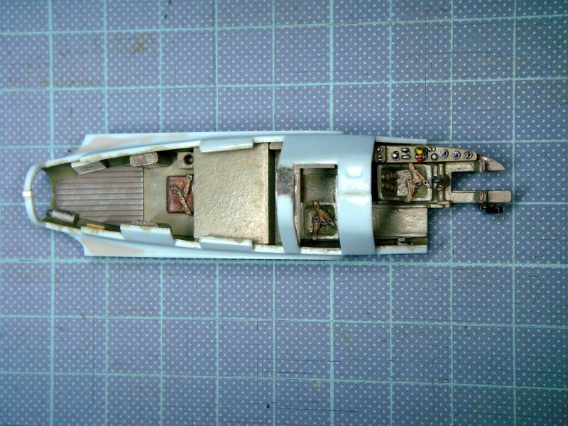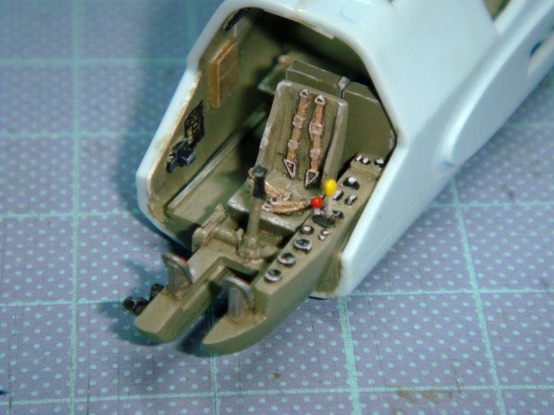 コクピット周りはちょっと寂しいので資料本を参考にキャビンポッドのデッチアップからスタート。ここでコクピットのサイドコンソールではキットパーツの計器、スイッチ類配列がちゃんと実機どおりであことを発見(少々オーバスケールですが)。ここでもさすがエアフィックスだ、と思った次第。キャビン内部は手持ちのジャンクパーツを色々使ってそれらしく追加工作。しかしクリアパーツとの合いが宜しくありません。やむなくここはまずクリアパーツを接着してから隙間と段差をパテやプラの細片等で埋め、クリア部分も含めて面一に削り込んで研磨しています(クリアパーツの肉厚に感謝)。