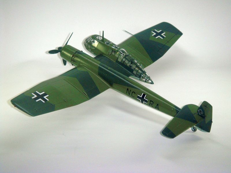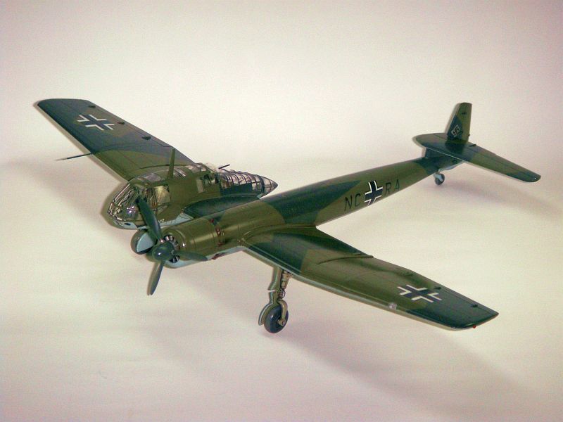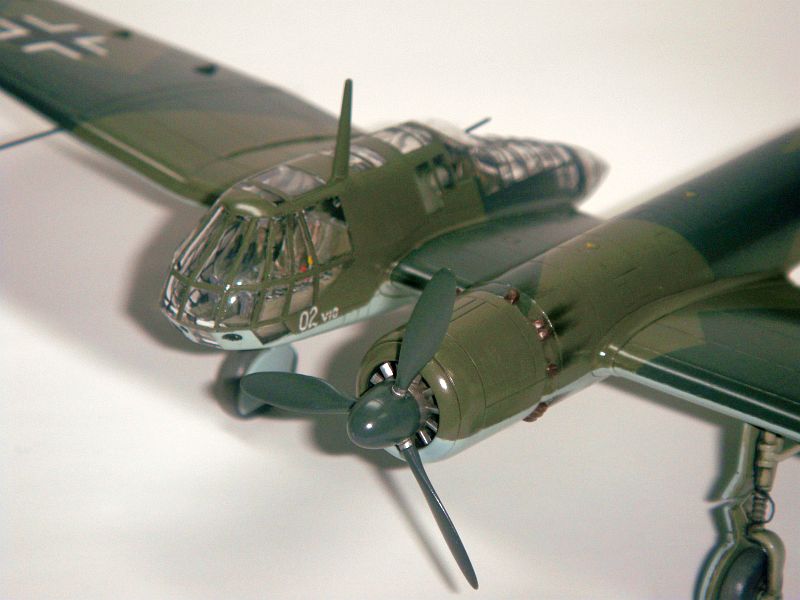 塗装は当時のドイツ空軍標準で上側面RLM70/71のスプリンター迷彩、下面はRLM65。スプリンターパターンはキット指定や他資料等の間でまちまちですが、塗り直し部分の色調差や影を塗り分けパターンと見ているようなものもあり、はっきりとしません。その中でTechnical Guide本のカラーイラストを改めて見ると「これ、ドイツ空軍多発機用の標準パターンでは?」ということに気がつき、今回その標準パターンに近いパターンを採用しました。