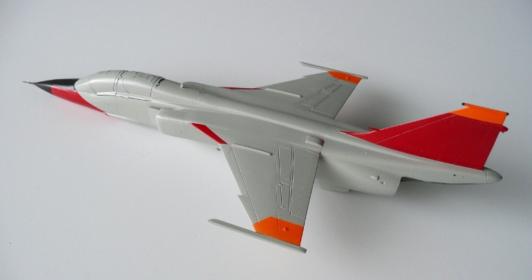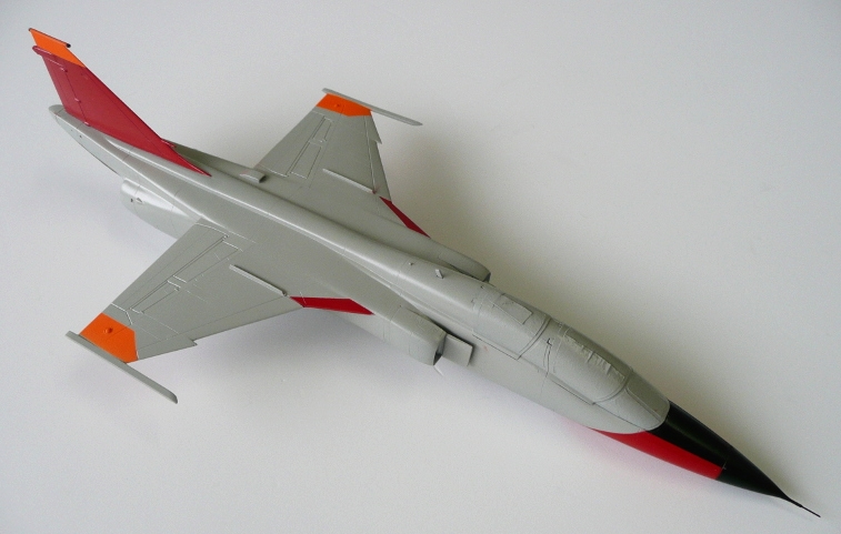 次に胴体・主翼部の塗装です。まず、ジェット排気口周辺の耐熱金属部の金属塗装を焼鉄色+銀色の混合塗料で行いました。乾燥後その部分をマスキングし、機体全体をライトガルグレー(FS16440)で塗ります。次にマスキングして機首部、主翼ストレーキ部、垂直尾翼をインターナショナルオレンジ(Mr.ColorのC79、シャインレッド)で塗装し、主翼端と垂直尾翼端を蛍光オレンジ(Mr.ColorのC173)で塗りました。さらにマスキングして機首レドームと垂直尾翼先端の後方レーダ警戒装置のレドームをセミグロスブラックで、またウィンドシールドと機首上面の防眩部を艶消しブラックで塗装、最後に主脚とエアーブレーキの各収納部を白で塗装しました。(写真4~6)