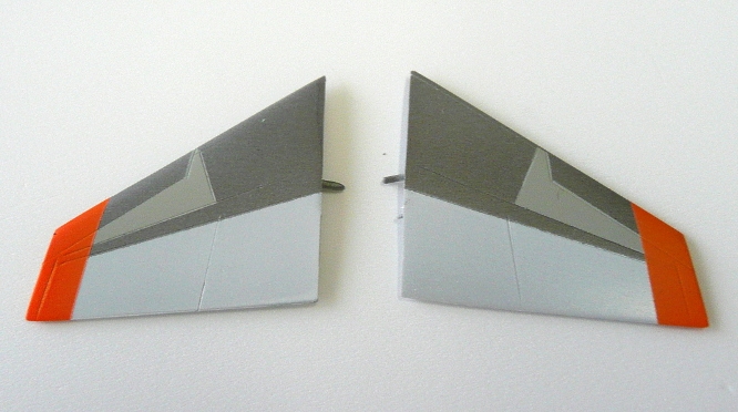 水平尾翼は筋彫りも終えているのであとは塗装だけです。水平尾翼は翼の中心線から前半が耐熱金属色、後半が白色、耐熱金属部の中央部にアルミの地肌、翼端に蛍光オレンジといった配色となっており、小さな翼ですがマスキングしながらコツコツ塗っていきます。(写真7)が塗装を終えた水平尾翼です。