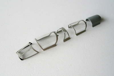(写真10)が排気ノズル。それなりにモールドされています。(写真11)が機体に取り付ける直前、プレキシガラス部のマスキングを外したウィンドシールドとキャノピーです。右端に写っているのは、後席キャノピーの内側に取り付ける金属カバーです。