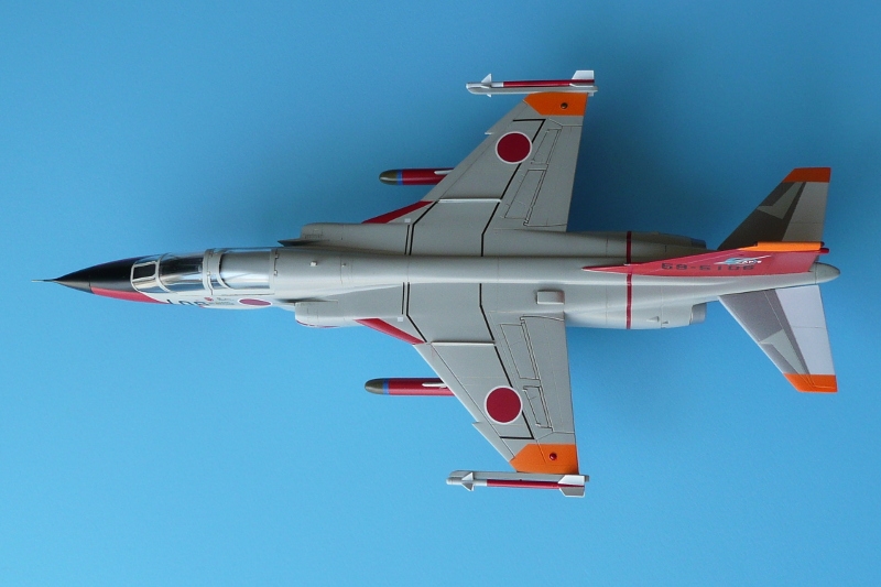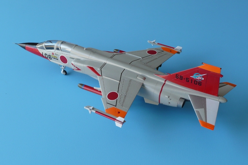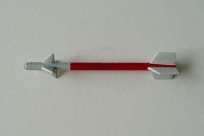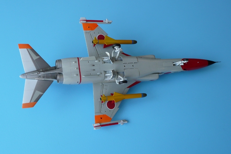 キットに入っていたXAMS-1とAIM-9Bサイドワインダーを搭載することにしたものの、どちらもあまり出来が良くなく整形に時間を要しました。XASM-1はインターナショナルオレンジと黄橙で塗分け、ブルーのラインを入れました。レドームの色は浜松基地広報館に展示されていた色を思い出し、それらしいオリーブドラブを塗って誤魔化しています。AIM-9Bは訓練弾の色が分からず、入間基地で目にしたF-104Jが搭載していた訓練弾の配色にしました。本当にこんな塗装のAIM-9Bを搭載したという確証はありません。